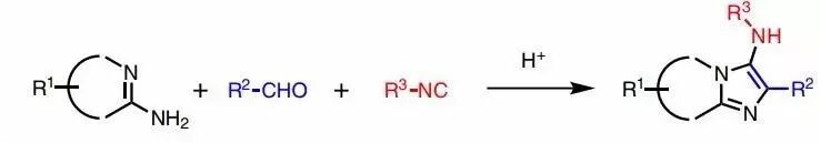 2-氨基吡啶,2-氨基嘧啶,2-氨基吡嗪或2-氨基噻吩等含有H2N-C=N结构化合物,醛和异腈一锅法缩合得到氨基咪唑的反应。此反应是多组分反应,机理与Ugi反应类似。