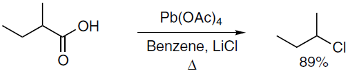 羧酸与醋酸铅及卤离子(Cl,Br,I)进行卤代脱羧,产物为少一个碳的卤代烃。这一反应与Hunsdiecker反应互补,适用于合成仲或叔氯代烷。