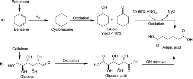 ▲Scheme 1. Two routes for synthesis of adipic acid. a) The conventional industrial route. b) The biomass-based route.
