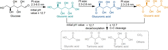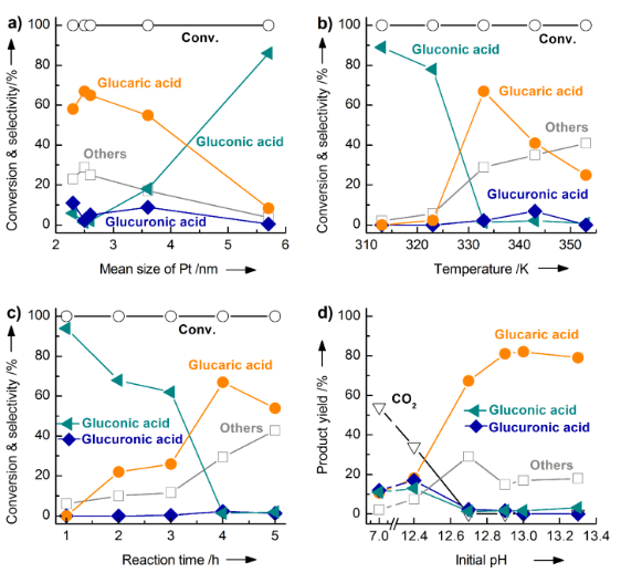 Pt/CNT催化剂中Pt纳米粒子的平均粒径是葡萄糖二酸形成的关键因素(Figure 1a)。Pt平均粒径过大(5.7 nm)或过小(< 2.5 nm)的催化剂均不利于葡萄糖二酸的生成。在Pt粒径大的催化剂上,主要产物为葡萄糖酸;小粒径的Pt催化剂可以促进葡萄糖酸进一步氧化生成葡萄糖二酸,但Pt粒径过小又会导致C-C键断裂产生乙醇酸和酒石酸等短链羧酸。Pt平均粒径为2.5 nm的Pt/CNT催化剂性能最佳。动力学研究表明,在较低温度(313-323 K)葡萄糖醛基优先氧化生成葡萄糖酸(Figure 1b)。升温至333 K时,葡萄糖二酸的选择性显著提高。经时反应结果显示葡萄糖酸是初级产物,延长反应时间葡萄糖酸不断被消耗,葡萄糖二酸的选择性逐渐增加(Figure 1c)。可见,葡萄糖酸是生成葡萄糖二酸的关键中间体(Scheme 2)。此外,葡萄糖醛酸也是中间体。在整个反应中葡萄糖醛酸选择性低,可能是由于醛基的氧化速率快于葡萄糖酸中的末端羟基。经时反应表明,短链羧酸的选择性在较长的反应时间内增加明显(Figure 1c)。这些短链羧酸与葡萄糖二酸平行形成或通过其连续氧化形成(Scheme 2)。反应介质的pH值在控制产物选择性方面发挥重要的作用(Figure 1d)。在中性水溶液中,CO2是主要产物。通过碱(例如KOH)调控反应介质的初始pH值,葡萄糖二酸的选择性增加。在初始pH = 12.9,葡萄糖二酸(葡萄糖二酸钾盐)的收率达到82%。控制实验表明,在碱性条件下一方面葡萄糖二酸以盐的形式存在更加稳定,另一方面酸性产物更容易从催化剂表面脱附,避免了深度氧化等副反应从而有助于获得高的葡萄糖二酸选择性。▲Figure 1. Selective oxidation of glucose over Pt/CNT. a) Effect of mean sizes of Pt particles. b) Effect of reaction temperature. c) Effect of reaction time. d) Effect of initial pH value of reaction medium. Reaction conditions: Pt/CNT (Pt loading 5 wt%), 0.10 g; glucose, 0.50 mmol; H2O, 20 mL (initial pH = 12.7 except for d); O2, 1 MPa; temperature, 333 K (except for b); time, 4 h (except for c).