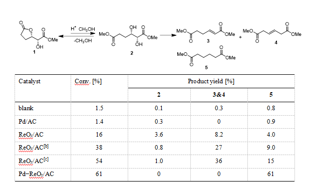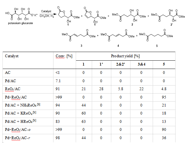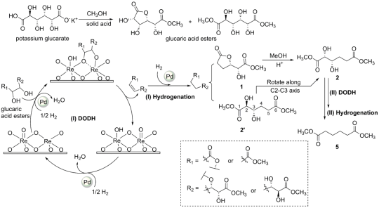 Pd-ReOx/AC催化剂上葡萄糖二酸脱羟基的反应机理如Scheme 3所示。ReOx物种,特别是表面双核Re-O-Re催化转化葡萄糖二酸生成相应的烯烃,同时催化剂被氧化。Pd纳米粒子通过活化解离H2提供活泼氢一方面参与DODH反应,另一方面促进被氧化的Re-O-Re催化剂还原。烯烃在Pd上加氢制得饱和中间体(如1和2')并进一步转化为2,随后产物2经历第二次DODH和加氢反应最终生成己二酸。▲Scheme 3. Proposed reaction mechanism for the conversion of glucaric acid (potassium glucarate) to adipic acid (methyl adipate) over Pd−ReOx/AC catalyst.