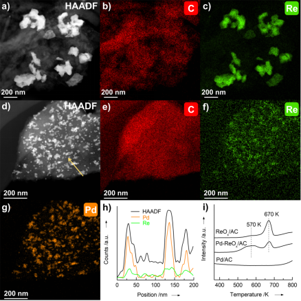 我们将典型的DODH催化剂,即ReOx/AC,用于第一步产物葡萄糖二酸钾的催化转化,主要得到脱除两个羟基的产物:1,具有一个羟基的五元环内酯;1',类似1但是环中含不饱和烯烃;2和2',具有顺式或反式两个羟基的直链酯(Table 1)。尽管也有四个羟基脱除产物(3、4和5),但这些产物的收率仅为27%。少量Pd修饰ReOx/AC不仅促进了中间产物(1'、3和4)C=C键的饱和,也提高了DODH性能(Table 1)。在Pd和Re负载量分别为0.5 wt%和5 wt%的双功能Pd-ReOx/AC催化剂上,己二酸(甲酯形式,5)收率为95%。提高Re的载量至10 wt%,己二酸的收率可达99%。Pd-ReOx/AC催化剂性能也优于Pd/AC和均相Re催化剂(NH4ReO4、KReO4和HReO4)组合。此外,Pd-ReOx/AC还可以催化转化其它各种生物质的脱羟基反应,如葡萄糖二酸内酯、粘酸、酒石酸和葡萄糖酸等。动力学研究表明,Pd和ReOx通过协同作用提高DODH性能。Pd-ReOx/AC相比ReOx/AC不仅活性更高,而且还促进中间产物1进一步脱羟基制己二酸甲酯(产物5)。以中间产物1作为原料对比实验结果显示,Pd与ReOx物种共存促进了1的脱氧反应(Table 2)。计算表明,五元环结构的1在能量上比线性结构的2更稳定。因此,2倾向于成环生成1。然而,提升2脱羟基反应速率,则能加速1和2之间的酯化平衡向2转化。因Pd修饰的ReOx显著增加了脱羟基反应,所以提高了1转化制5(己二酸酯)的效率(Table 3)。Table 1. Catalytic deoxygenation of glucaric acid.[a][a] Glucaric acid (in the form of potassium salt), 0.10 mmol (25 mg); catalyst (Re, Mo or V loading, 5 wt%; Pd loading, 0.5 wt%), 20 mg; Amberlyst-15, 40 mg; CH3OH, 5 mL; H2, 2.0 MPa; 383 K, 24 h. [b] Re accounts for 5 wt% in the mixed catalyst.Table 2. Catalytic deoxygenation of substrate 1.[a][a] Solution of 1 in CH3OH (15.8 mmol L-1), 5 mL; catalyst (Re loading, 5 wt%; Pd loading, 0.5 wt%), 20 mg; Amberlyst-15, 40 mg; H2, 2.0 MPa; 383 K, 4 h. [b] Re loading is 10 wt%. [c] Re loading is 15 wt%.表征结果显示ReOx/AC和Pd-ReOx/AC的Re物种均包含ReO2和ReO3,而且催化剂表面ReOx物种相似,包括ReVI(33-35%),ReIV(57-58%)和ReVII(7.8-8.5%)。ReOx/AC催化剂中ReOx粒子直径为85-300 nm(Figure 2a-c)。Pd修饰后,ReOx粒子尺寸减小至~20 nm,且多数ReOx物种与Pd纳米粒子(直径~20 nm)相邻(Figure 2d-h)。Pd还能促进ReOx物种在较低温度下还原(Figure 2i)。这些结果表明Pd纳米粒子主要位于ReOx物种附近,并且Pd不仅增强了ReOx的分散,而且促进了高分散的ReOx物种的还原。▲Figure 2. Characterizations of ReOx/AC and Pd−ReOx/AC catalysts. a) HAADF-STEM image of ReOx/AC. b) and c), EDS mapping patterns of carbon and rhenium over ReOx/AC. d) HAADF-STEM image of Pd−ReOx/AC. e) EDS mapping patterns of carbon, rhenium and palladium over Pd−ReOx/AC. h) Line-scanning elemental distribution for Pd−ReOx/AC along the yellow arrow in d). i) H2-TPR profiles.