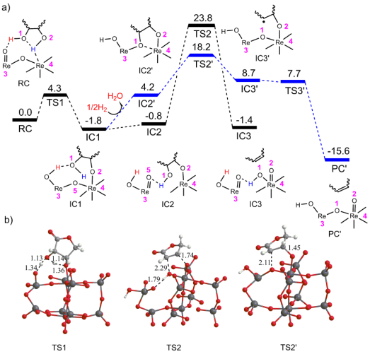 为确定活性ReOx物种,对Pd-ReOx/AC分别进行氧化和还原处理制备了Pd-ReOx/AC-o和Pd-ReOx/AC-r两个参比催化剂。Pd-ReOx/AC-r表面除ReIV(33%)和ReVI(18%)外,主要包含Re0(49%);Pd-ReOx/AC-o表面仅含有ReVI(72%)和ReVII(28%)物种。催化性能对比研究显示,Pd-ReOx/AC-o和Pd-ReOx/AC性能相当,而Pd-ReOx/AC-r催化剂上己二酸甲酯的收率显著低于前者(Table 1)。这表明高价态(ReVI)的ReOx物种很可能是脱羟基活性中心。以具有ReVI价态的Re10O30簇模拟催化剂进行密度泛函理论计算,结果揭示表面双核五配位Re-O-Re是活性中心(Figure 3)。从RC开始,质子从底物分子O1转移至表面Re3=O并形成Re4-O2键,能垒仅为4.3 kcal mol-1(RC→IC1)。O5与中心Re4断键后(IC1→IC2),底物分子经TS2过渡态生成烯烃和氧化的催化剂,该步需要越过25.6 kcal mol-1能垒(IC1→IC3)。因为Pd和ReOx协同效应明显,我们推测Pd解离H2产生的活泼氢参与了反应。因此,在IC1中引入一个H原子脱水,形成IC2'(Figure 3)。IC2'脱氧生成烯烃和氧化的Re催化剂(PC')比没有H参与的路线(TS2)更有利,能垒可降低5.6 kcal mol-1。此外,Pd纳米还促进PC'的还原,与H2-TPR一致。▲Figure 3. a) DFT-calculated Gibbs energy profile (in kcal mol-1) for the surface ReO3-catalyzed DODH of diols, shown along with schematic drawings of key intermediates along the reaction pathway. b) Optimized geometries of key transition states involved in the reactions.