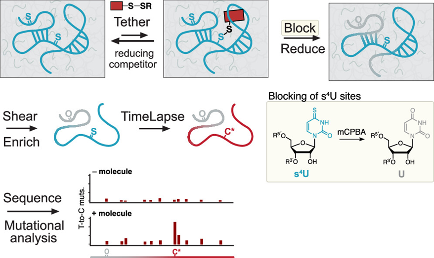 在转录组水平捕获小分子与RNA相互作用的技术可以实现对可能作为治疗靶点的RNA的全局性分析。但目前依赖于不可逆化学反应的鉴定弱结合相互作用的方法可能会捕获反应性最强的位点,而非亲和力最高的位点。因此,作者关注到用于研究蛋白质-小分子相互作用和靶向特定RNA的二硫键捕获策略,将其拓展到转录组水平,开发了一种基于二硫键栓系的Tether-seq方法,用于识别整个转录组中的小分子结合位点。