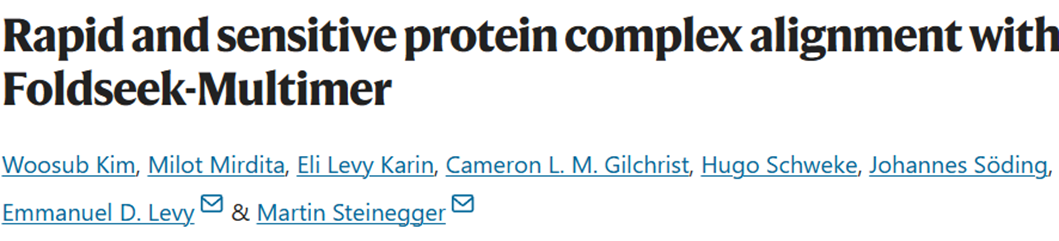分享一篇发表在Nature Methods上的文章,文章标题“Rapid and sensitive protein complex alignment with Foldseek-Multimer”,文章的通讯作者是来自首尔大学的Martin Steinegger教授和魏茨曼科学研究所的Emmanuel D. Levy教授。其中Steinegger课题组主要从事蛋白质序列和结构比对方面的研究。